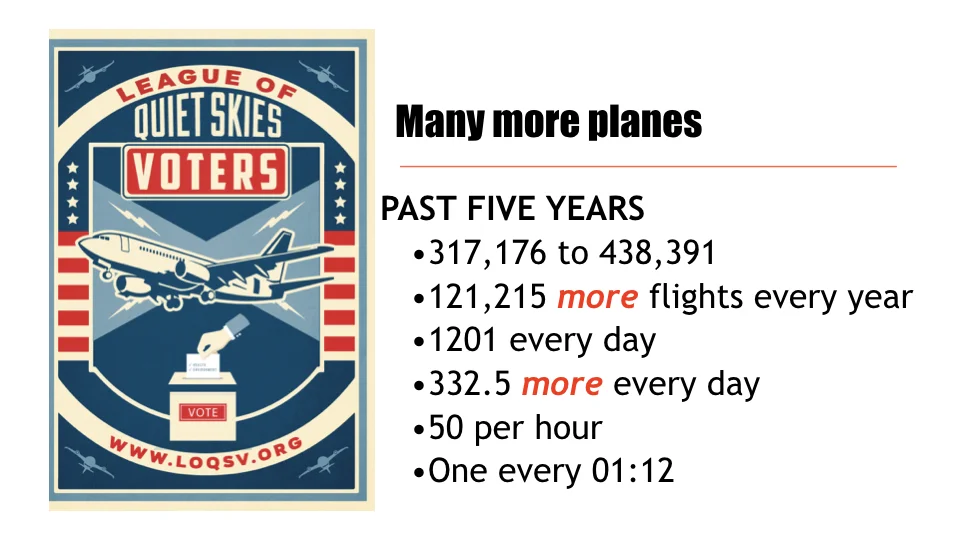 The League of Quiet Skies Voters seeks to inform and empower voters that live as neighbors to the 8th busiest airport in the United States with information about aviation operations, expansion, and the potential impacts upon human health and the environment.